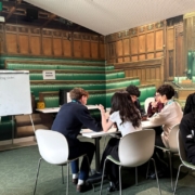 Following the tour, students took part in a lively Snap Election Workshop. Working in groups, they created their own political parties and manifestos, each addressing key social, educational, and environmental issues. The three parties: Restore, The Blue Party, The People’s Party and Fiesta, then went head-to-head, with each group’s election candidate delivering a persuasive presentation of their policies before facing questions from their peers.